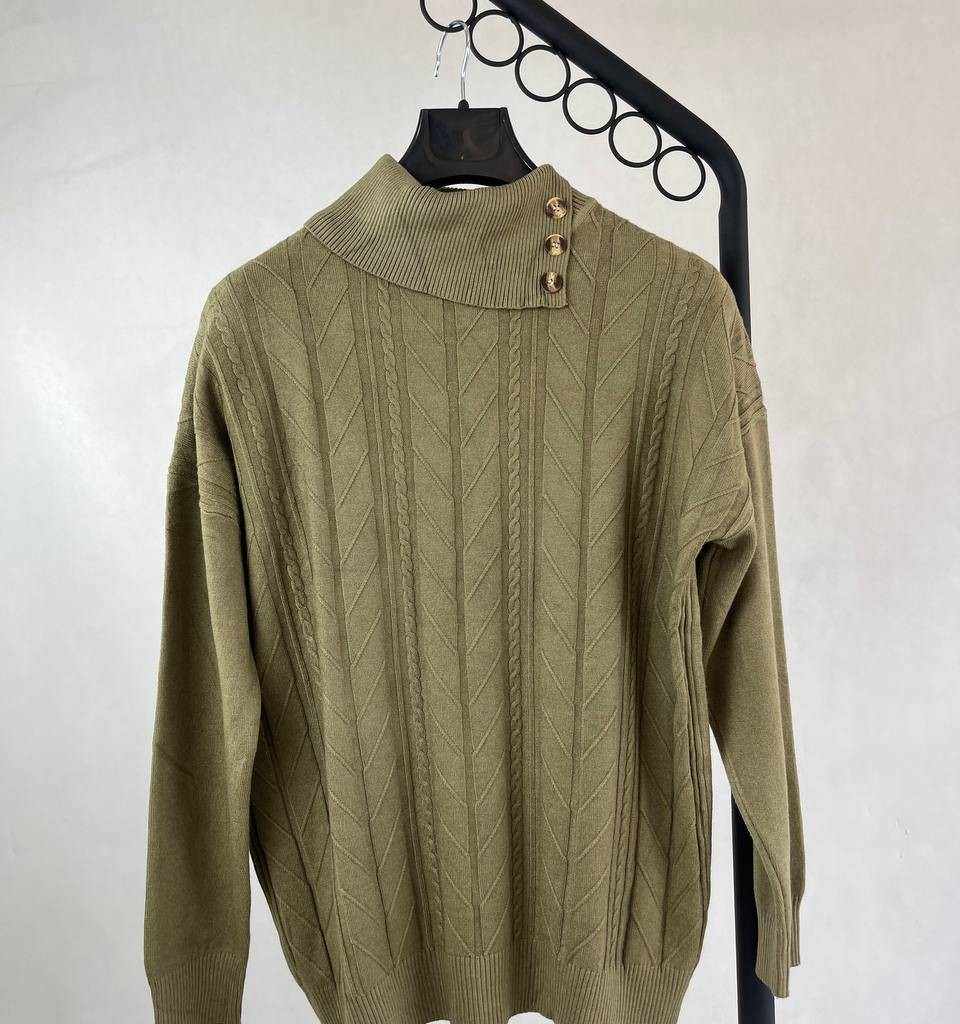 بافت زنانه سبز زیتونی با یقه بلند - طراحی کلاسیک و مناسب فصل پاییز و زمستان
