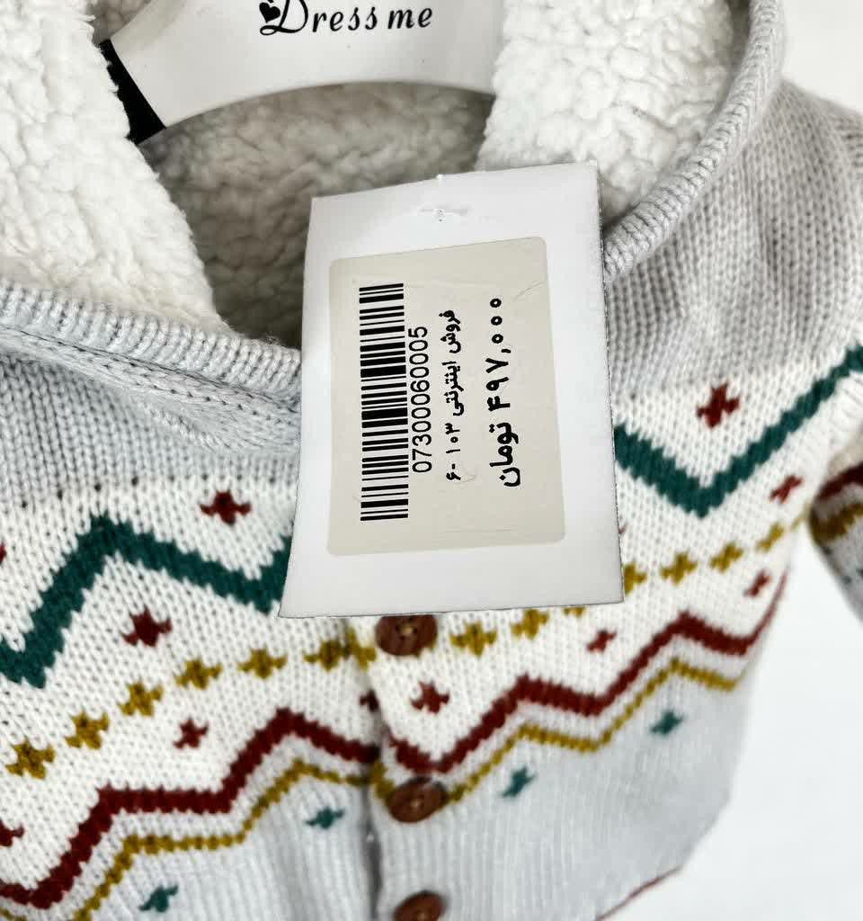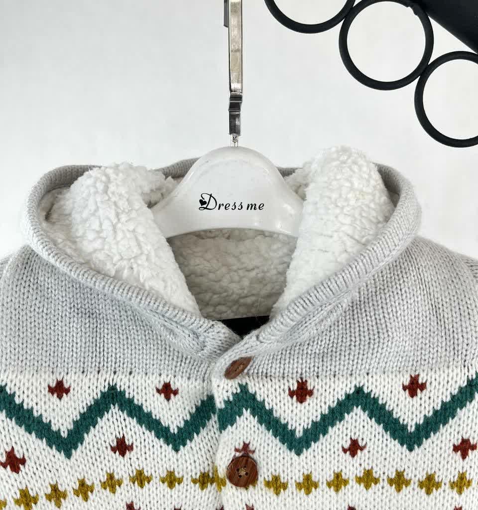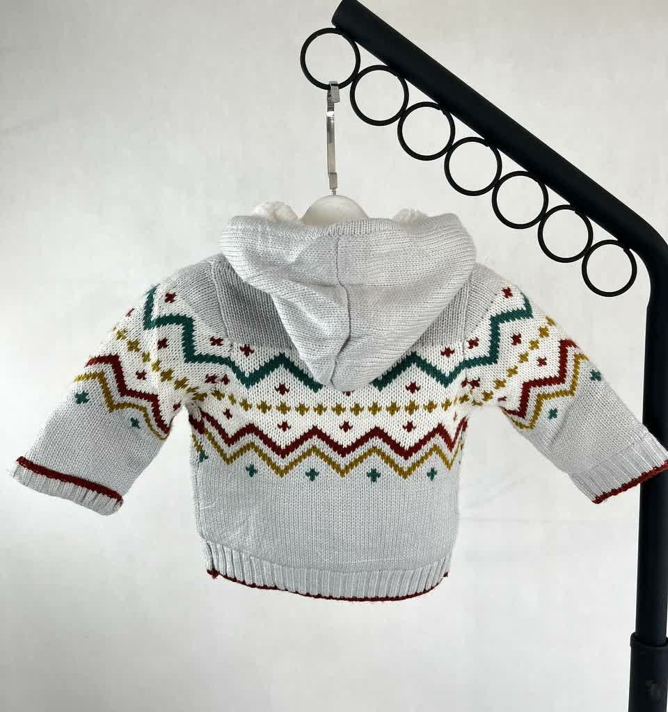 ژاکت بافت بچگانه طوسی با طرح هندسی رنگی و کلاه دار ، جنس گرم و نرم مناسب پاییز و زمستان . خوش دوخت و ضد حساسیت و ایده آل برای استفاده روزمره ، بیرون و استایل زمستانی